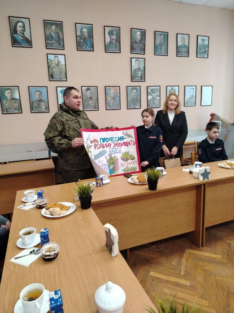 Эта встреча закончилась чаепитием, военнослужащие вручили памятные подарки кадетам. Школьники тоже поблагодарили военных за приглашение и передали подарок – стенгазету «Профессия Родину защищать».